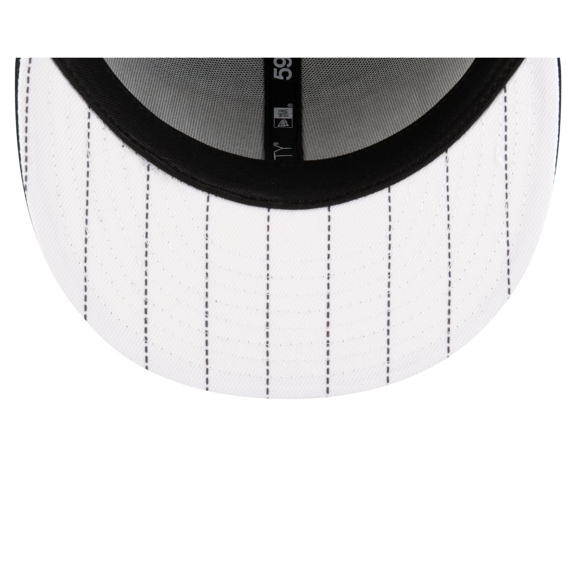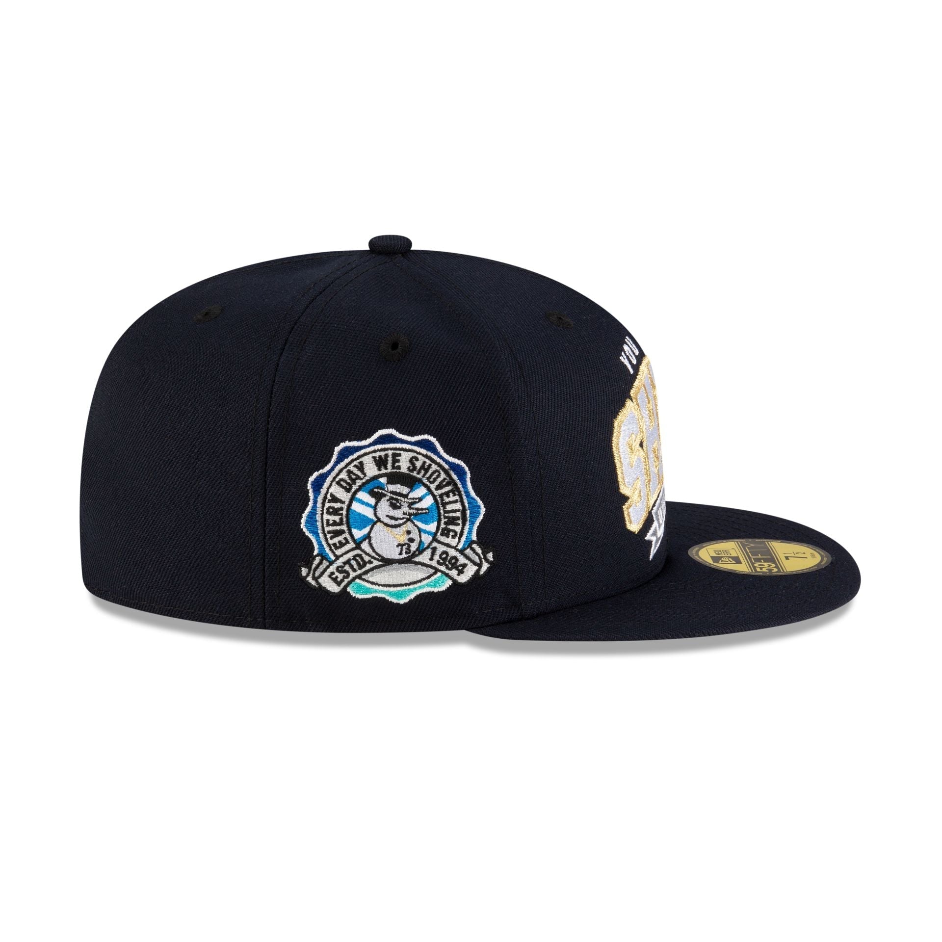 The You Already Shnow University Navy 59FIFTY Fitted Cap features an embroidered Shnow University wordmark at the front panels with an Every Day We Shoveling patch at the right-wear side. Additional details include a Buffalo at the rear and a pinstripe undervisor.